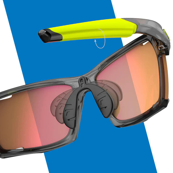 Las piezas ajustables para las patillas y la nariz le permiten tener un ajuste personalizado según la forma de su rostro. Las almohadillas de goma hidrófilas se hinchan cuando están mojadas y permanecen en su lugar cuando sudas.