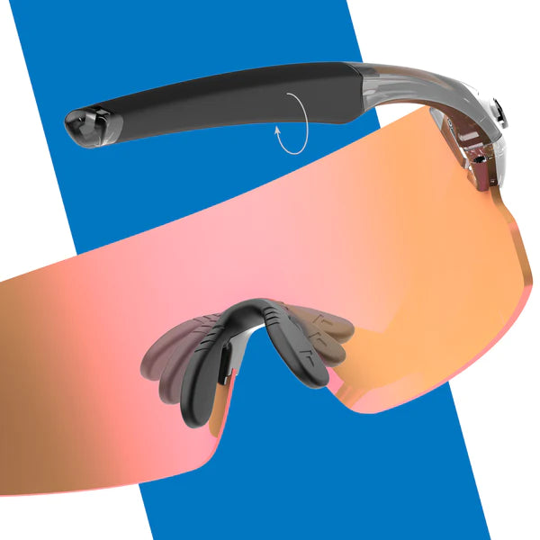 Las piezas ajustables para las patillas y la nariz le permiten tener un ajuste personalizado según la forma de su rostro. Las almohadillas de goma hidrófilas se hinchan cuando están mojadas y permanecen en su lugar cuando sudas.