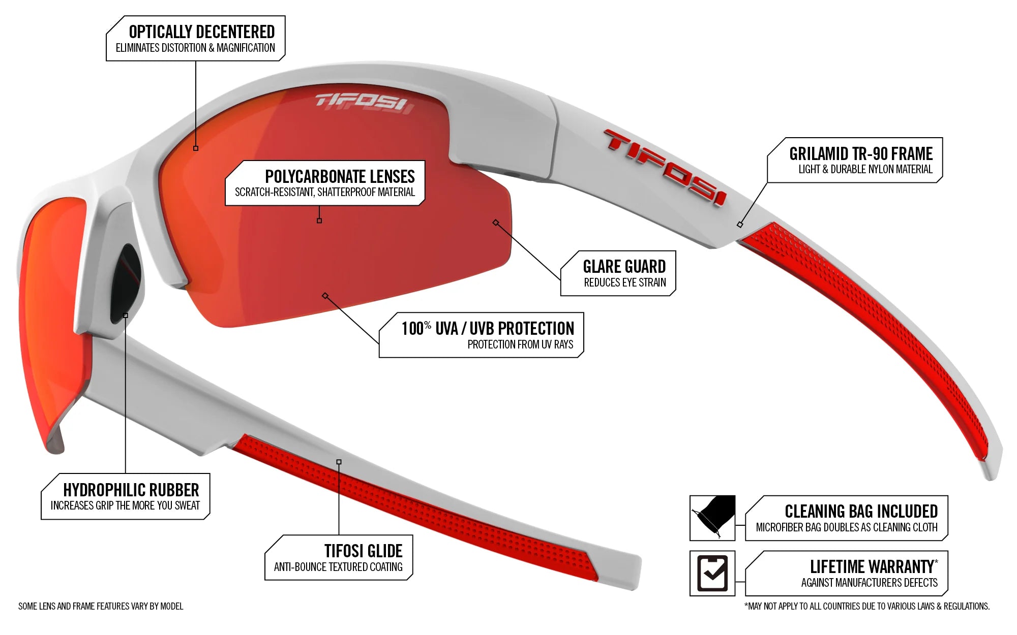 - TECNOLOGÍA DEL MARCO ➤ Almohadillas nasales hidrofílicas que aumentan el agarre cuanto más sudas. La tecnología de deslizamiento Tifosi permite que el marco se deslice cómodamente y proporciona un ajuste anti-rebote.