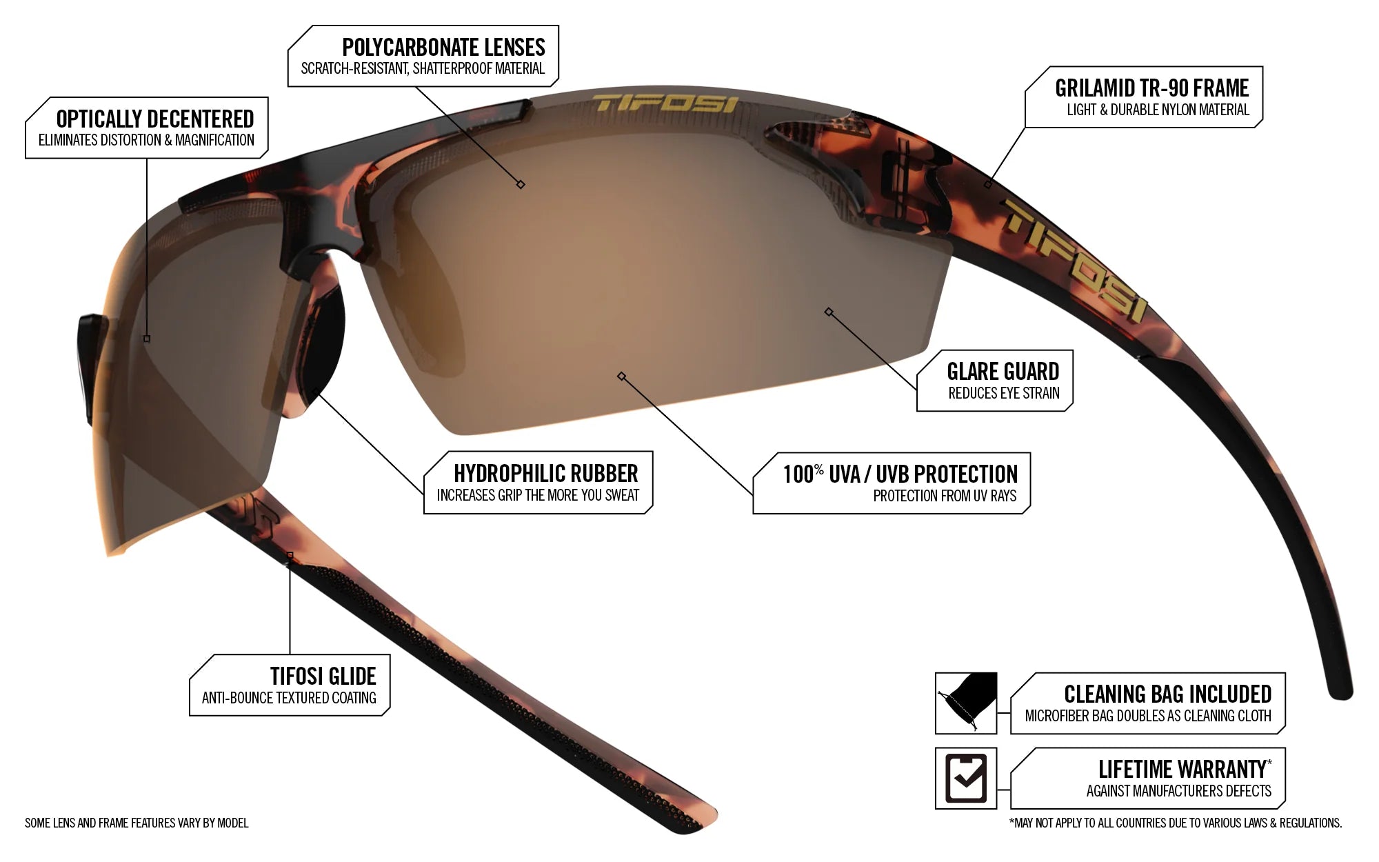 - TECNOLOGÍA DEL MARCO ➤ Almohadillas nasales hidrofílicas que aumentan el agarre cuanto más sudas, la tecnología Tifosi Glide permite que el marco se deslice cómodamente y proporciona un ajuste anti-rebote.